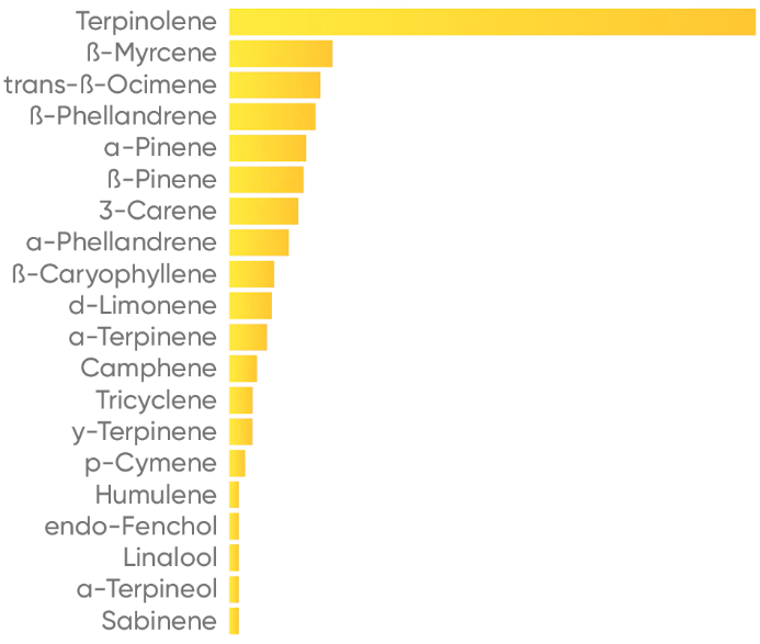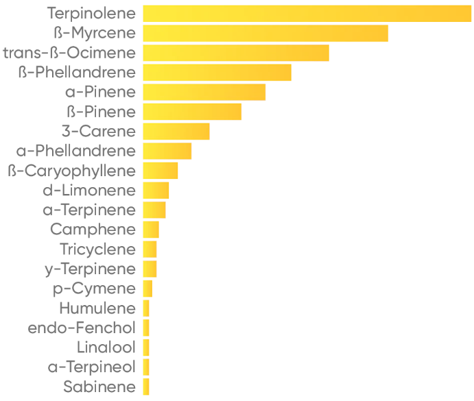 Higher concentration of dominant terpenes leads to a less complex aroma. Effects will be mainly driven by the top terpene.